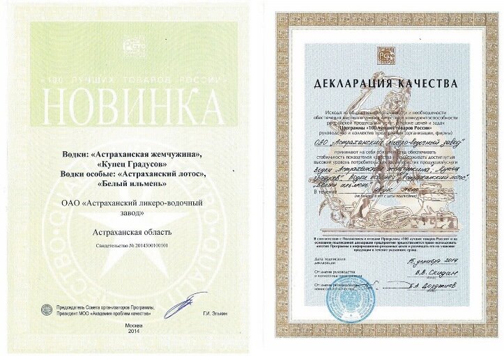 В номинации «Продовольственные товары» наши водки: «Астраханская жемчужина», «Купец Градусов» и водки особые: «Астраханский лотос» и «Белый ильмень» удостоены звания Лауреата. Кроме того «Астраханский лотос», «Белый ильмень» и «Купец Градусов» получили диплом в номинации «Новинка».
